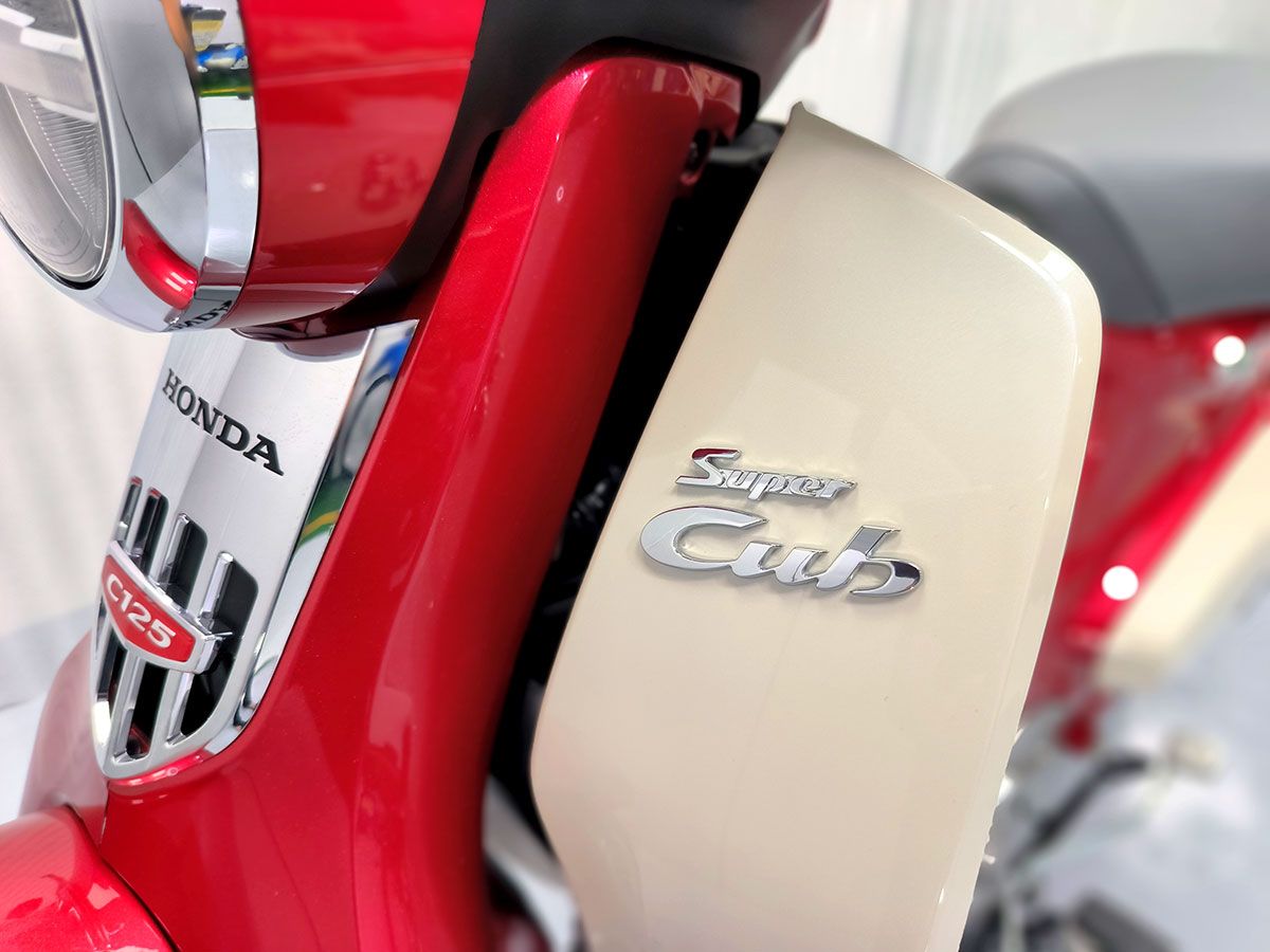 Biểu tượng logo Super Cub theo mẫu hoài cổ cũ được bố trí ở bên trái và bên phải của thân xe, tạo nên vẻ rắn rỏi và sang trọng. Tấm chắn chân với những đường nét đẹp mắt không chỉ mang tính thẩm mỹ mà còn có chức năng bảo vệ người lái khỏi gió và bụi bẩn.