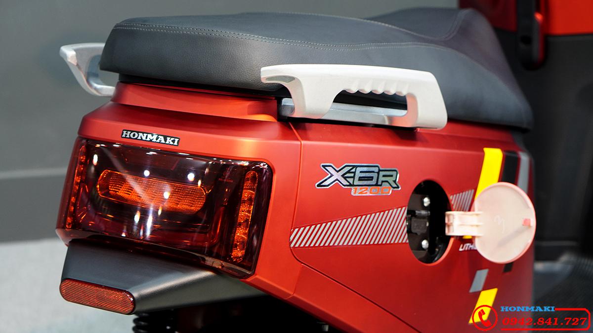Phanh đĩa bánh trước lẫn bánh sau rất An Toàn, đèn Led bao quanh xe một bộ ánh sáng hoàn hảo. Mặt đồng hồ hiển thị Honmaki X6R Pin Lithium màn hình màu lớn là kiệt tác sáng tạo, cụm công tắc nhiều Chức Năng gọn đẹp. Hộc chứa hành lý mini bên trái, chìa khóa Thông Minh Smart key.