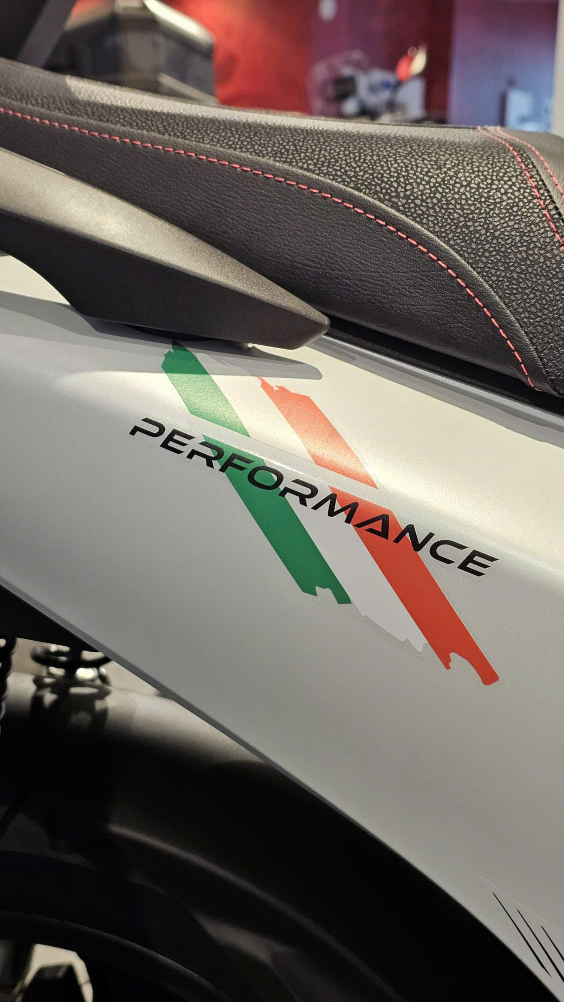 Yên xe được thiết kế hai chỗ với những đường chỉ may đỏ tương phản, mang lại cảm giác thể thao và tinh tế. Logo và các chi tiết khác như gương chiếu hậu cũng được tô điểm bằng những đường viền đỏ tạo điểm nhấn cho tổng thể.